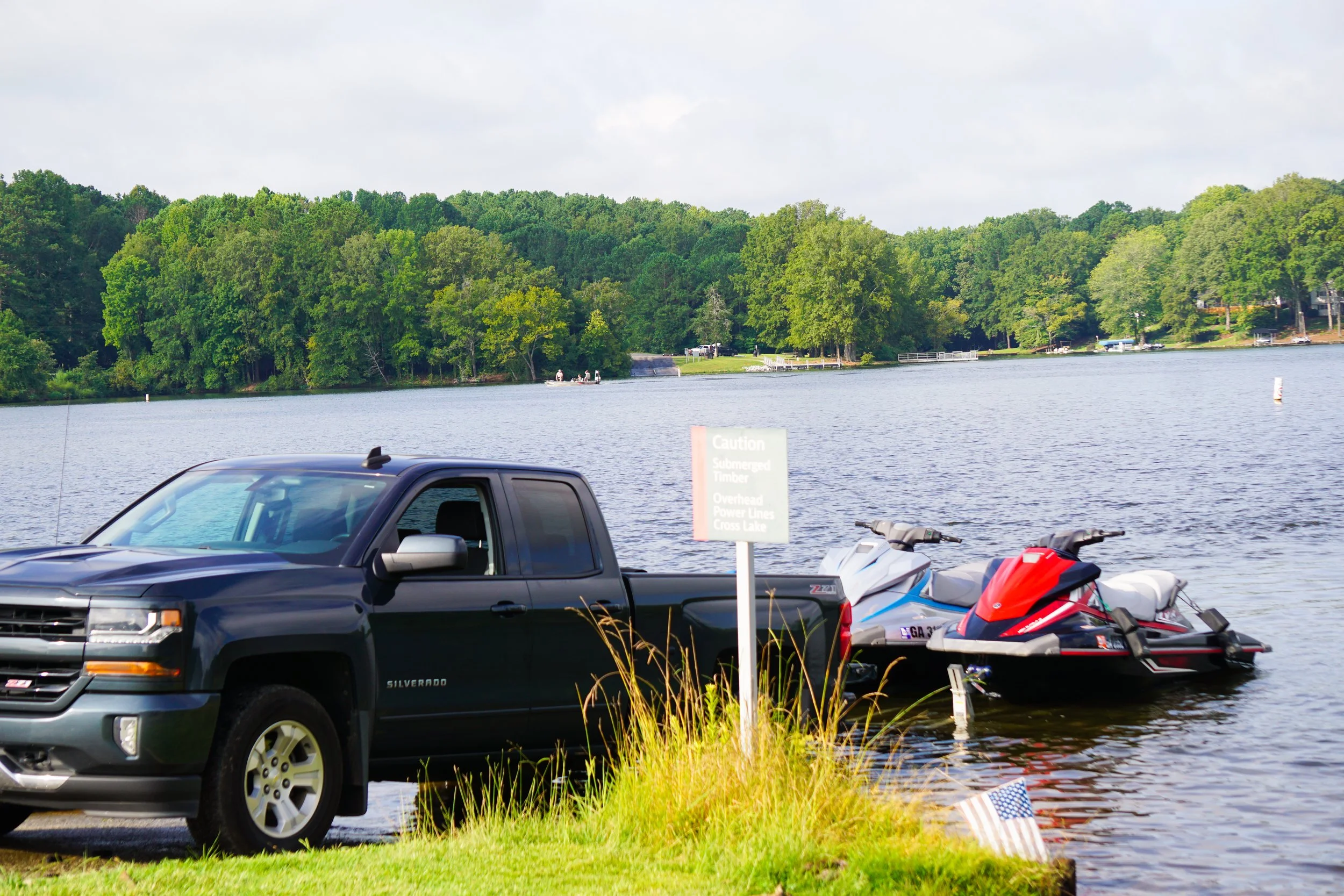 A black Chevrolet Silverado truck parked on the grassy shore of a lake with two jet skis in the water nearby. In the background, there are trees and a sign with caution instructions. An American flag is also visible on the ground near the water.