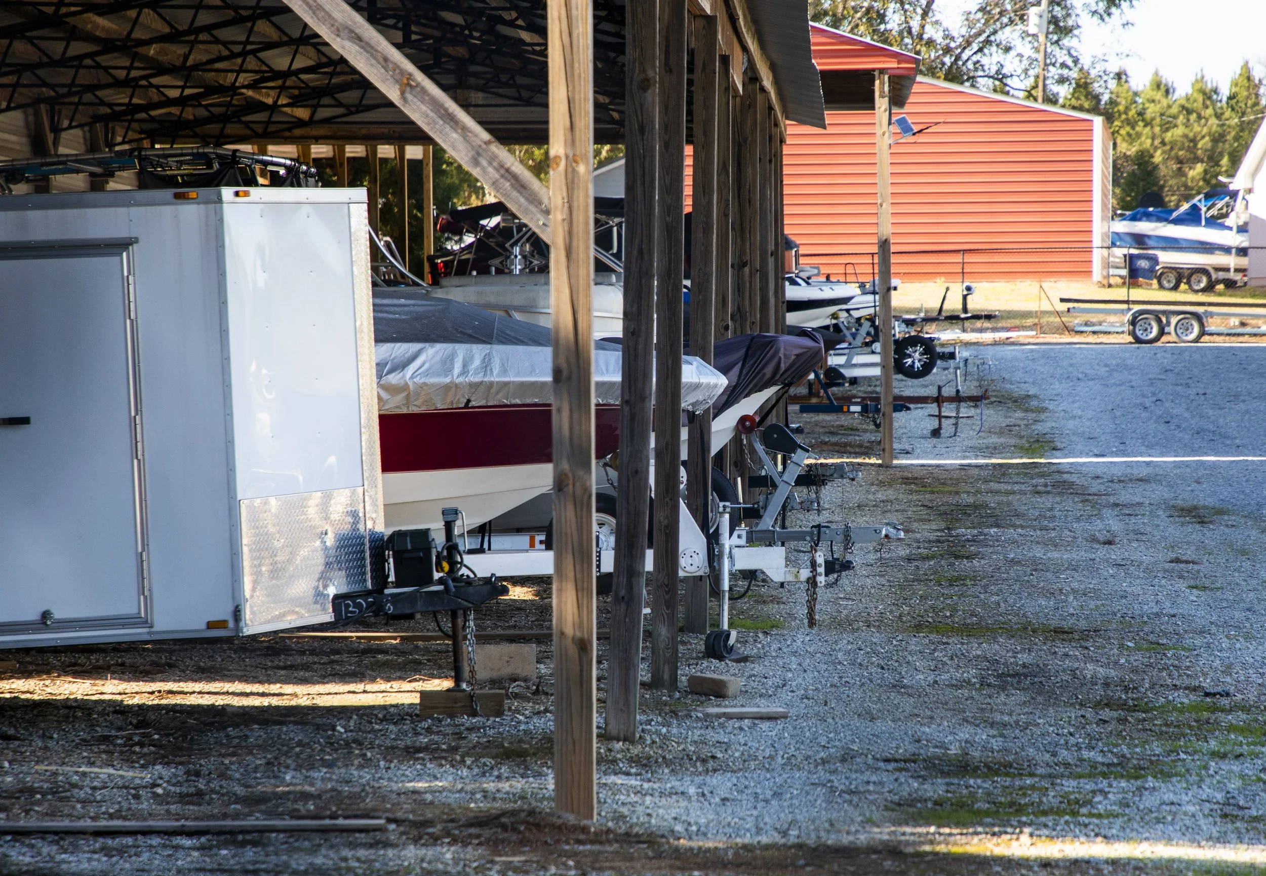 Boats stored under a shelter at a marina, with trailers and a gravel path visible.